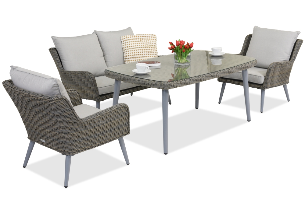 - Il set Bilbao Apetito 4 include 2 poltrone, un divano a due posti e un tavolo. È destinato a 4 persone.
