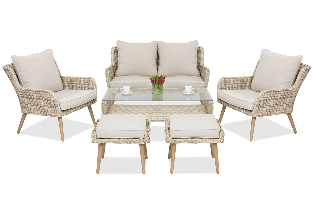 Il set Bilbao Coffee 4 proposto da Garden Point offre quattro posti a sedere con schienali e due pouf aggiuntivi.